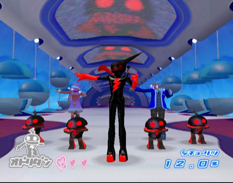 One of the reasons why this game is so fantastic is simply the presentation of it all. This game doesn't hold back from bringing in synchronized umbrella dancing, reflective purple disco suits, comical characters to save (bird-watchers?), and a special appearance by Space Michael Jackson himself (complete with Thriller dance-moves and singing "Hoooo!"). The additon of instruments is also very cool. Throughout various points in the game, Ulala will play instruments instead of dancing - such as an electric guitar duel and drum battle. There's also lyrics you can sing along with at times - which are sometimes fun, but generally feel a little forced on top of the music. |